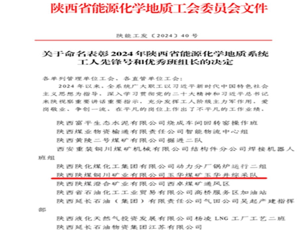 近日,陜西省能源化學(xué)地質(zhì)工會印發(fā)《關(guān)于命名表彰2024年陜西省能源化學(xué)地質(zhì)系統(tǒng)工人先鋒號和優(yōu)秀班組長的決定》(陜能工發(fā)〔2024〕40號),公司玉華礦綜采隊被授予省能化系統(tǒng)“工人先鋒號”榮譽稱號。