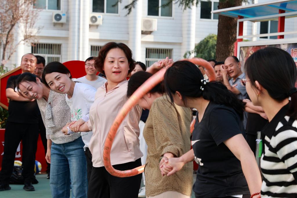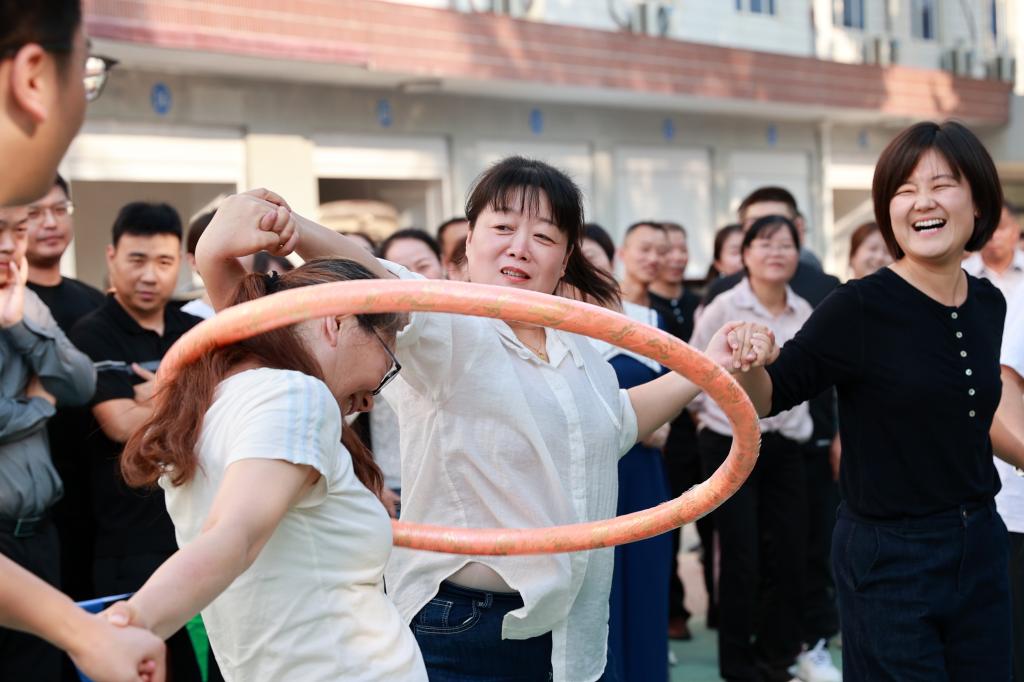 在“一圈到底”活動中,每組隊(duì)員形成橫隊(duì),手手相連,依靠肢體將呼啦圈穿過每個隊(duì)員,往返一次,用時最短參與隊(duì)名次越靠前。