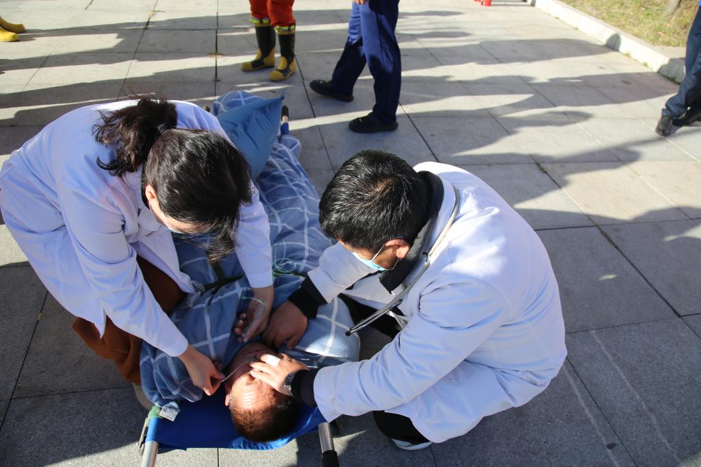 演練過程中,駐礦救護隊員們?nèi)缟癖旖?,迅速展開滅火救援,對準(zhǔn)著火點噴射,精準(zhǔn)壓制火勢。各樓層職工聞聲而動,在樓層引導(dǎo)員的指揮下,低姿彎腰、手捂口鼻、沿著墻壁快步前行,有序向樓下疏散。陳家山醫(yī)院救護人員第一時間對受傷員工進行急救,整個過程一氣呵成、緊張有序,盡顯專業(yè)素養(yǎng)與高效協(xié)同。