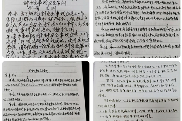 俗話說:“眼過千遍,不如手過一遍;手過一遍,不如落實萬遍”。該分公司認(rèn)真學(xué)習(xí)《生產(chǎn)安全事故應(yīng)急條例》,為全體職工發(fā)放學(xué)習(xí)筆記,通過抄筆記、寫心得、答試卷環(huán)環(huán)相扣,讓安全之心根植于職工心間。