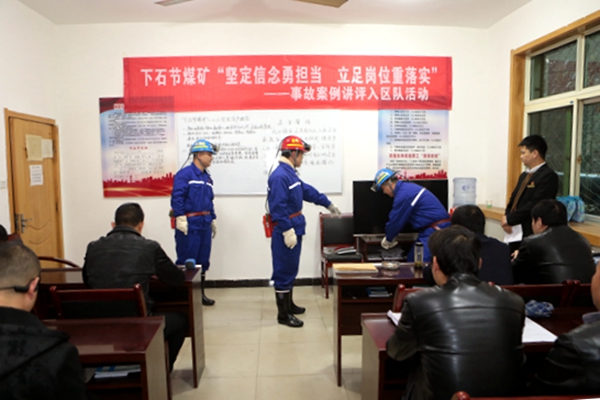 這是在該礦綜采隊(duì)8點(diǎn)班前會上四名團(tuán)員青年正在開展的事故案例講評活動。通過現(xiàn)身說教,進(jìn)一步增強(qiáng)職工安全意識,提升“自?;ケB?lián)保”能力,警示習(xí)慣性違章的危害,確保自覺踐行安全規(guī)程措施上起到了積極作用。通過還原事故經(jīng)過、講述事故后對家庭帶來的傷害、入情入理地講評剖析,使職工在接受教育和深刻反思中,將安全理念時(shí)刻牢記于心,落實(shí)于行。