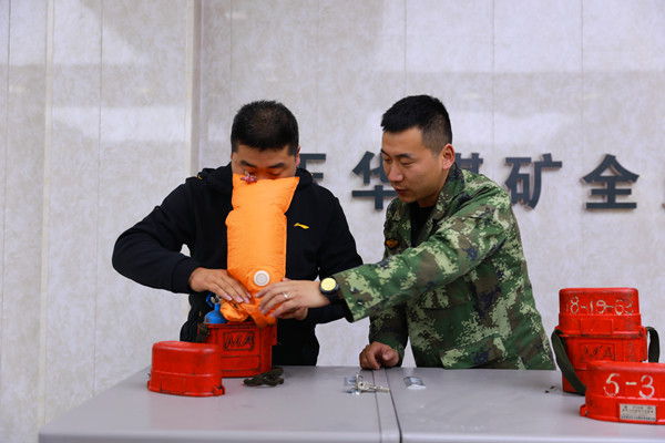 在前期組織一輪自救器使用操作的理論學習熱潮之后,礦井立即組織開展了一輪實操培訓和隨機抽查。救護隊員來到基層區(qū)隊班前會、全員安全考試培訓中心、副井口候罐大廳等地,辦起了實操課堂,救護隊員一邊演示、一邊講解,手把手講授方法技巧。“眼過千遍,不如手過一遍”,培訓鼓勵職工輪流進行實操演練,詳細講解正確佩戴和使用自救器。