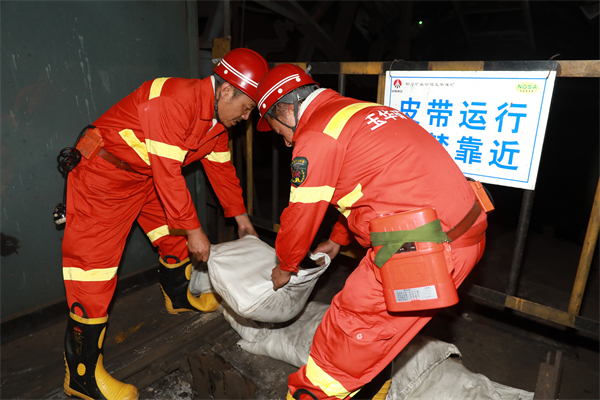 演練開始。礦防汛指揮部“叫應(yīng)”各區(qū)域、各單位的應(yīng)急搶險、值守人員在調(diào)度中心緊急集合。按照規(guī)定時間,2個戰(zhàn)備值班救護小隊和25名搶險救災(zāi)人員及工程、救護車輛,裝載著鐵鍬、編織袋、管路等物資集結(jié)待命??傊笓]通報汛情,隨機選取主斜井井口作為演練地點,模擬強降雨造成地面積水,且水位迅速上漲,存在雨水倒灌井口風(fēng)險。運轉(zhuǎn)隊組織主斜井區(qū)域全部人員迅速撤離,搶險救災(zāi)隊伍聞警出動到達現(xiàn)場,專人排查清點撤離職工,并就近打開防汛物資庫,使用已充填沙袋在井口快速構(gòu)筑臨時擋水墻。
