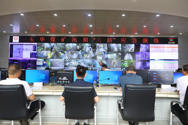 上午10時整,演練正式開始。此次汛期“三防”演練的情景設定為,在接到市氣象部門發(fā)布的暴雨橙色預警信息后,雨勢不斷加劇,北風井工業(yè)廣場積聚水位逐漸抬高,存在大量積水由北斜井灌入井下的風險,嚴重威脅井下作業(yè)人員的安全。信息調(diào)度指揮中心嚴格執(zhí)行緊急情況停產(chǎn)撤人制度,迅速由帶班礦領導組織井下作業(yè)人員按照避災路線緊急撤離。