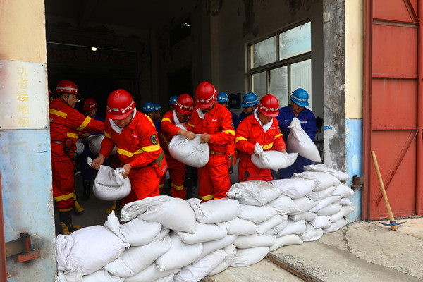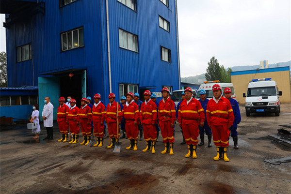 根據(jù)演練設定模擬險情,該礦立即啟動《汛期“三防”應急預案》,地面指揮部統(tǒng)一指揮協(xié)調(diào)應急救援工作??傊笓]發(fā)出集結指令,10分鐘之內(nèi),防汛應急指揮部全體成員集結完畢,礦防汛搶險小隊、駐礦救護中隊火速到達集合點,應急救援的技術、安全、醫(yī)療、保障、通訊等小組各自就位??傊笓]按照預案指定各專業(yè)救援小組和防汛搶險各小隊,立即趕赴災情地點,實施應急處置。整體應急搶險救援分為兩步驟同時進行,搶險組出發(fā)趕往北風井工業(yè)廣場,在北斜井井口使用防汛專庫物資構筑堅實的防水墻,安裝應急排水泵、連接排水管等進行排水作業(yè),有效防止雨水倒灌。救援組在南風井接應井下撤離人員,并對升井人員進行清點人數(shù),對身體不適人員進行詢問檢查和醫(yī)療救治。經(jīng)過一個半小時的搶險作業(yè),險情得到有效處置,圓滿完成此次防汛搶險演練。