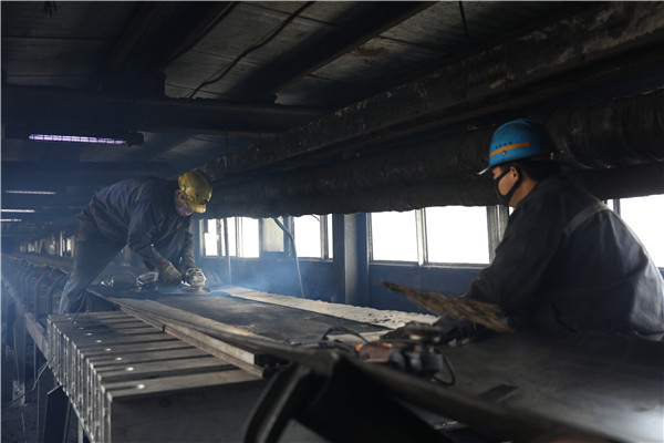 井巷中,傳來(lái)陣陣“一二、嘿喲……”的號(hào)子聲,打破了一片寧?kù)o,機(jī)電車間職工抬起管路步伐有力堅(jiān)定。綜采隊(duì)職工迅速就位,按照技術(shù)要求拆卸裝置,一二部膠帶進(jìn)行合并。主斜井機(jī)尾處,運(yùn)轉(zhuǎn)隊(duì)職工為膠帶上夾板硫化9#接頭。南風(fēng)井儲(chǔ)水池內(nèi),職工穿上防水服疏通管路。螺旋篩倉(cāng)里,職工正在使用氧焊修復(fù)襯板。一時(shí)間從井下到地面,檢修的旋律瞬間奏響。