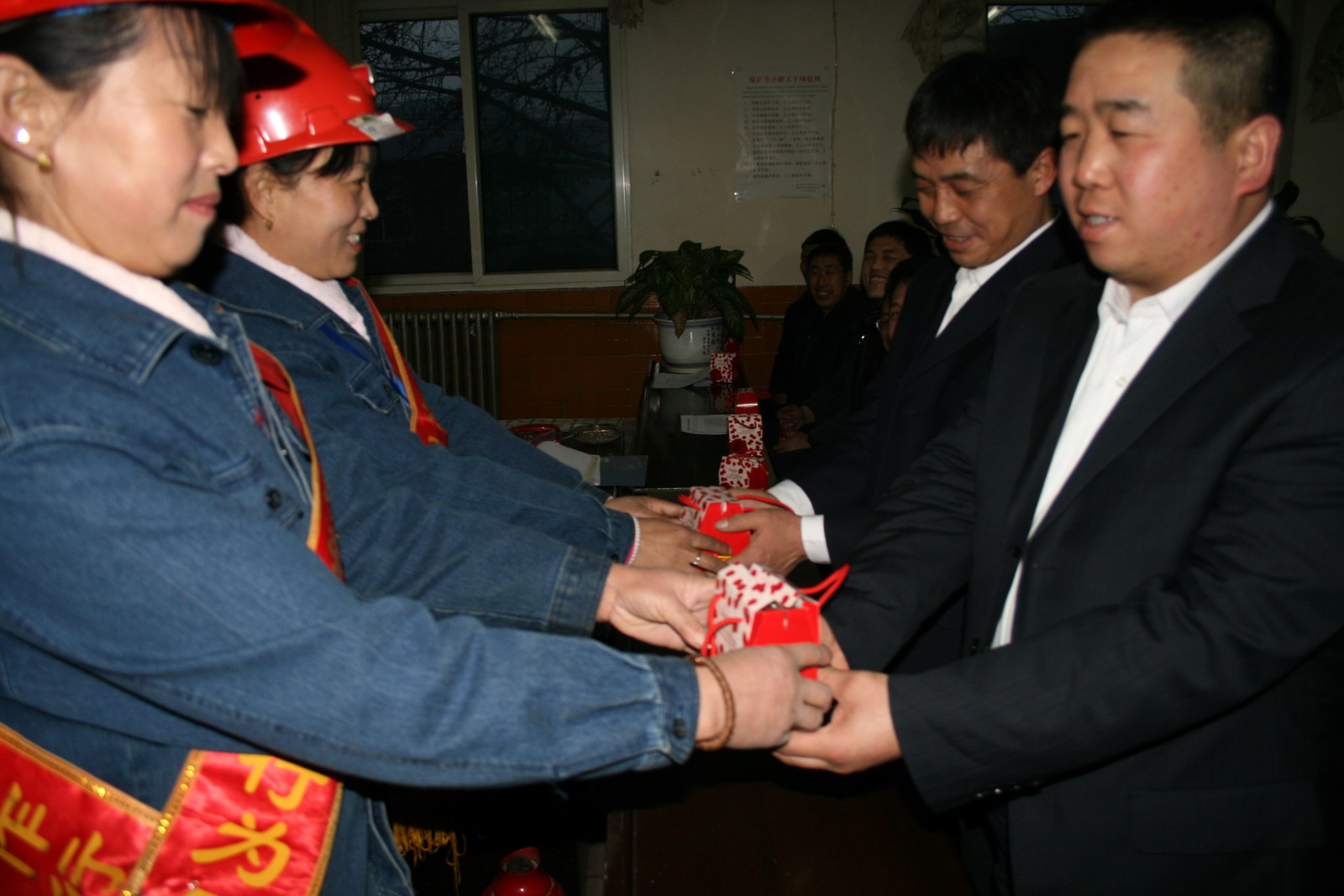大年初一早7時30分,徐家溝公司各生產(chǎn)區(qū)隊上早班員工剛進行完班前安全禮儀,退管科黨支部組織的礦嫂安全服務(wù)隊的礦嫂們分組同時走進區(qū)隊學(xué)習(xí)室,給堅守生產(chǎn)崗位的員工拜年送溫馨。