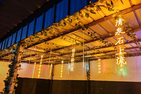 當(dāng)夜幕降臨,煤臺(tái)的休息區(qū)仿佛被注入了魔力。暖黃色的燈光,透過(guò)翠綠藤蔓的間隙,灑下一片片斑駁的光影。王維筆下的詩(shī)句“明月松間照,清泉石上流”,化作靈動(dòng)的燈飾,在微風(fēng)中輕輕搖曳。藤蔓如綠色的瀑布般垂下,光影與綠意交織,營(yíng)造出一種寧?kù)o而雅致的氛圍,讓職工感受到了一絲別樣的詩(shī)意。