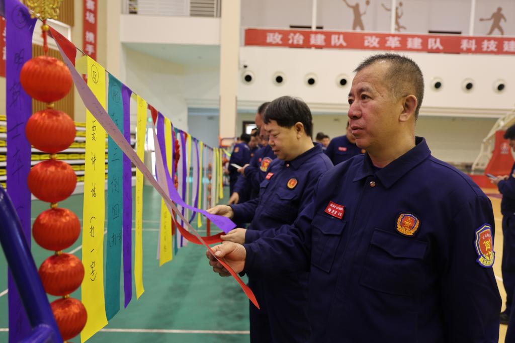 活動(dòng)現(xiàn)場,100余條燈謎掛滿了綜合訓(xùn)練館,既有通俗易懂的字謎、成語謎,更有應(yīng)急救援知識、安全生產(chǎn)法規(guī)、黨建應(yīng)知應(yīng)會等專業(yè)內(nèi)容。“救援小隊(duì)每隊(duì)不少于多少人?”“透水事故救援首要任務(wù)是什么?”這些平日里印在訓(xùn)練手冊上的知識點(diǎn),如今化身趣味謎題,吸引著隊(duì)員們競相駐足。