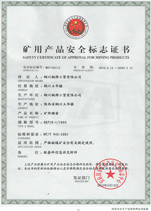 近日,奧博集團(tuán)楓樺公司自主研發(fā)的SKP18-1/1860礦用錨索順利通過安標(biāo)國家礦用產(chǎn)品安全標(biāo)志中心認(rèn)證,并取得證書。據(jù)悉,這是該企業(yè)取得的第四項(xiàng)礦用產(chǎn)品安標(biāo)證書。
