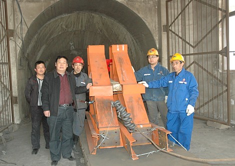 現(xiàn)場指揮領(lǐng)導(dǎo)及工人護(hù)送膠帶設(shè)備入井