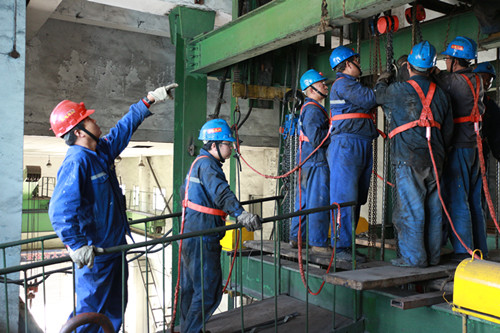 該礦結合當前安全生產(chǎn)工作實際,針對生產(chǎn)中遇到的問題,在公司各部門大力支持下,以破解生產(chǎn)瓶頸、強化設備管理、保安全促生產(chǎn)為目標,提前謀劃、精心組織,動員全礦上下全力以赴投入到副井更換提升鋼絲繩、4#皮帶更換減速機、南風井更換2#破碎機減速機、主斜井硫化5#接頭等共10大項36個小項檢修任務當中。為保證按時保質保量順利完成檢修任務,礦成立了檢修領導小組負責協(xié)調指揮各項工作,層層落實責任,將檢修任務分解到13個基層單位,嚴格按照組織、技術、安全及危險點預控等措施組織施工。加強檢修現(xiàn)場的安全管理,各項檢修工作按照準備工作到位、開工驗收到位、“三重跟班”到位、措施學習到位、防護設施到位、安全監(jiān)督到位的“六到位”要求進行。