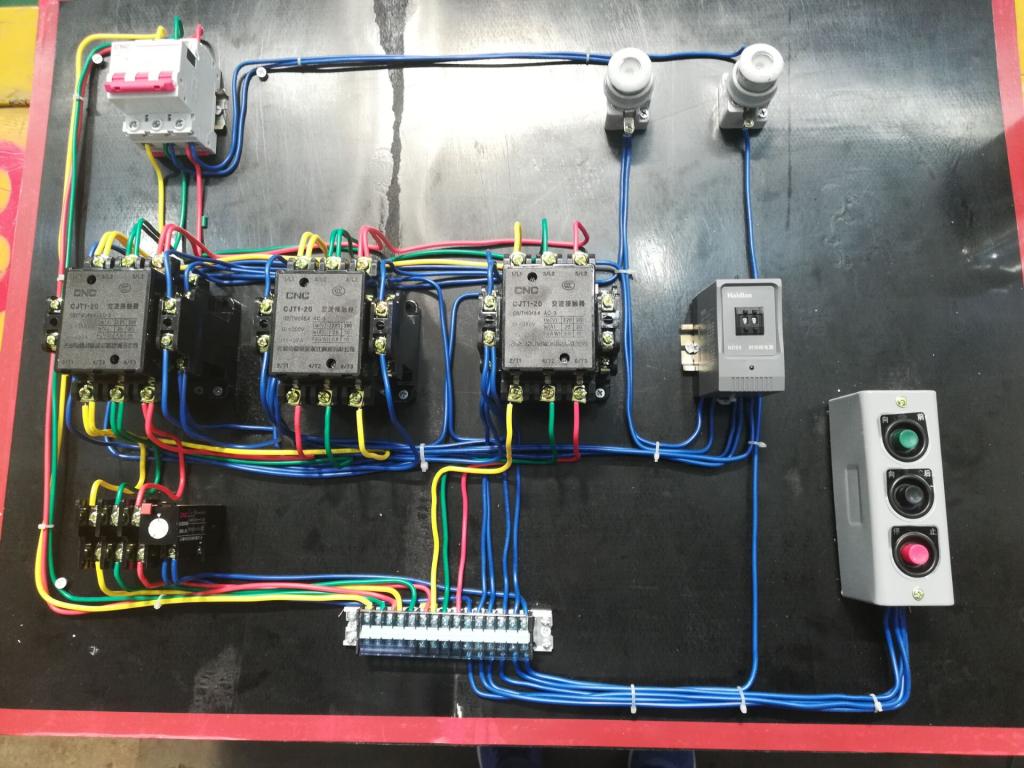 7月30日上午,實(shí)操比賽開始了,題目是根據(jù)電路圖在配電盤上實(shí)現(xiàn)電機(jī)順序啟動(dòng)延時(shí)正反轉(zhuǎn)功能。