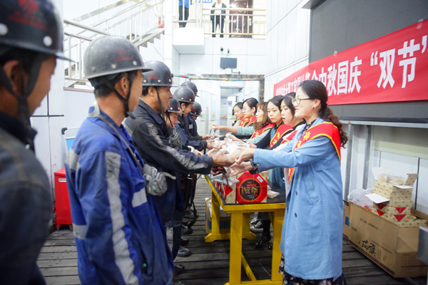 10月1日,在國慶、中秋“雙節(jié)”當(dāng)日,柴家溝井工會女工家屬協(xié)管會組織女工協(xié)管員,在井口開展了“同喜同賀家家團(tuán)圓、同歡同樂人人平安”雙節(jié)井口慰問活動,為一線職工送上節(jié)日問候和溫暖祝福。