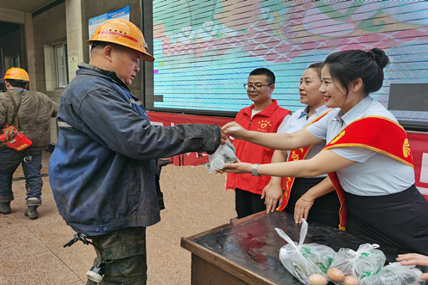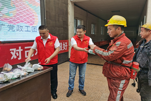 6月14日,端午節(jié)當(dāng)天,陳家山煤礦在井口開展“迎端午保平安送祝?!蔽繂柣顒?dòng),向職工們送上端午祝福和安全囑托。