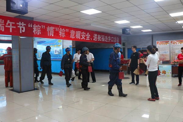 淡淡粽葉香,粒粒健康米,點點祝福情。端午節(jié)當天,礦井開展“粽”情“粽”意囑安全、送祝福進井口活動,礦黨政領導及女工協(xié)管員一大早走進候罐大廳,將香甜可口的粽子、節(jié)日情誼的香包、充饑消渴的雞蛋西瓜送到剛剛升井的職工手中,向他們送上節(jié)日祝福,道出一句“你辛苦了”表達敬意和感謝,送來一句“生產再忙、安全第一”的安全囑語。