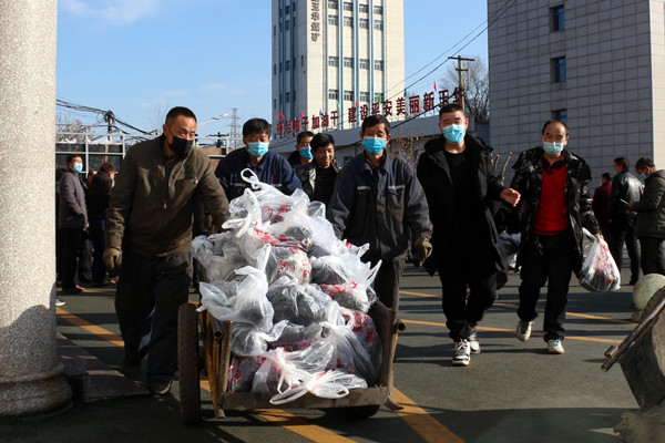 1月17日,玉華煤礦信息中心樓前年貨發(fā)放現(xiàn)場,清點(diǎn)數(shù)目、輪流裝卸、前拉后推、肩挑身扛,一份份沉甸甸的年貨為職工送去新春祝福,礦區(qū)洋溢和諧喜慶年味足。