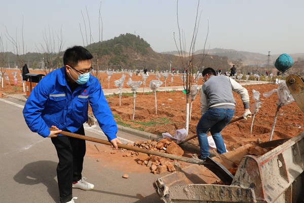 三月沐風(fēng),礦山凝云。3月14日下午,玉華煤礦黨員干部及青年志愿者帶頭走進北風(fēng)井綠植區(qū),除雜草、撿石塊,給景觀樹木脫去“冬裝”,用勞動美為春光平添一抹新綠。