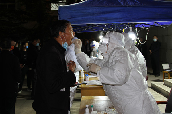 3月14日晚上11時,原本一片安靜的文化廣場卻在全員夜戰(zhàn),醫(yī)務(wù)人員正在為陳家山礦全體職工進行核酸檢測。