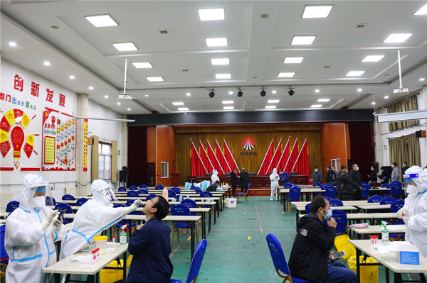 同時,青年志愿者宣傳引導職工正確、快速填寫預約碼登記信息,快速配合采樣檢測。保衛(wèi)部門維護秩序,防止檢測前后人員聚集?;鶎訂挝话凑諜z測工作要求,錯時分批組織職工前往檢測點。10余名醫(yī)務(wù)人員共設(shè)立3個采樣臺,對前來采樣的職工分流依次檢測,醫(yī)務(wù)人員嫻熟、嚴謹?shù)闹貜椭∈米?、采樣、裝試管等一系列動作,快速高效完成核酸檢測工作。