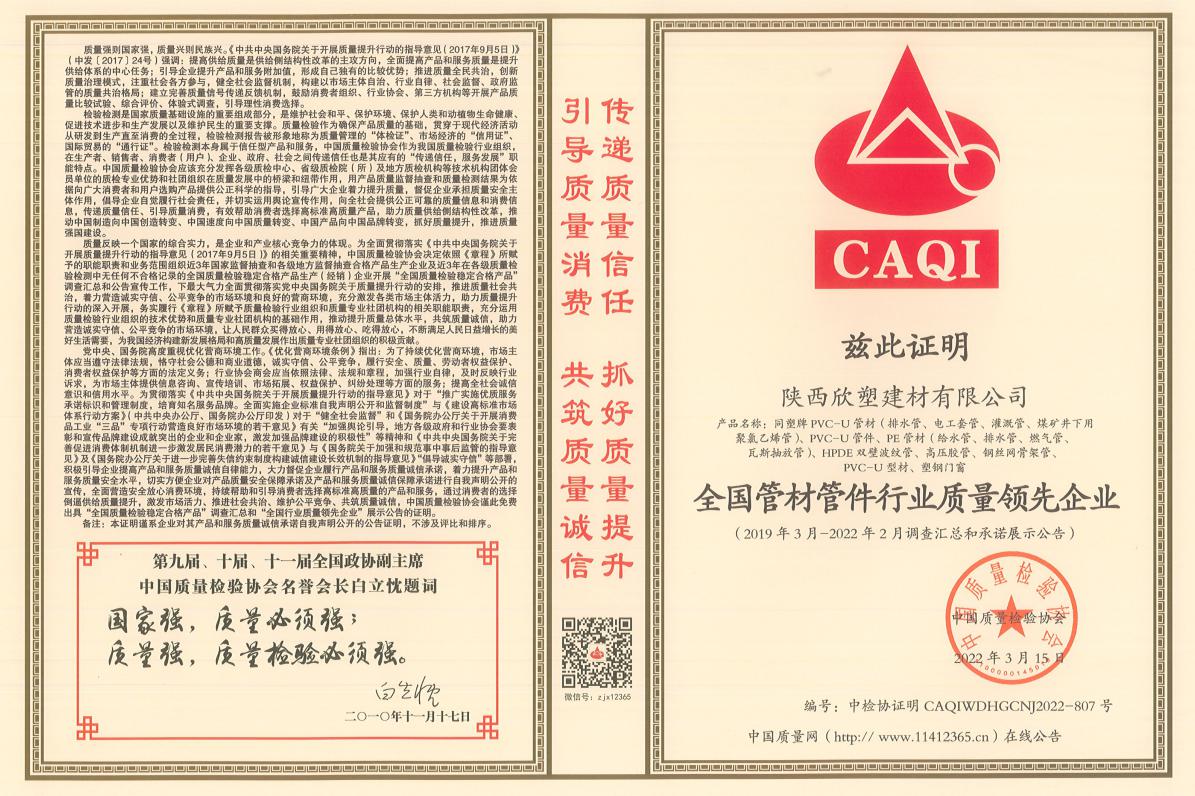 近日,從中國質(zhì)量檢驗協(xié)會傳來消息,欣塑公司喜獲“全國管材管件行業(yè)質(zhì)量領(lǐng)先企業(yè)”殊榮。