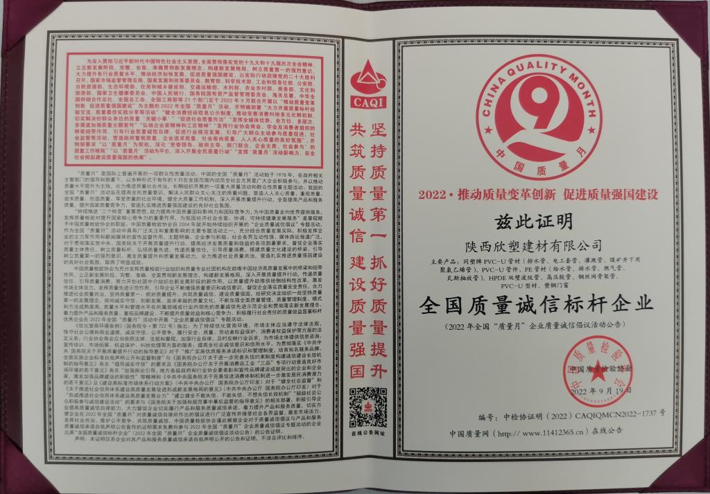 近日,在中國質(zhì)量檢驗協(xié)會組織開展的2022年全國“質(zhì)量月”企業(yè)質(zhì)量誠信倡議專題活動中,欣塑公司憑借過硬的產(chǎn)品質(zhì)量,良好的誠信服務(wù),榮獲了“全國質(zhì)量誠信標(biāo)桿企業(yè)”榮譽稱號。