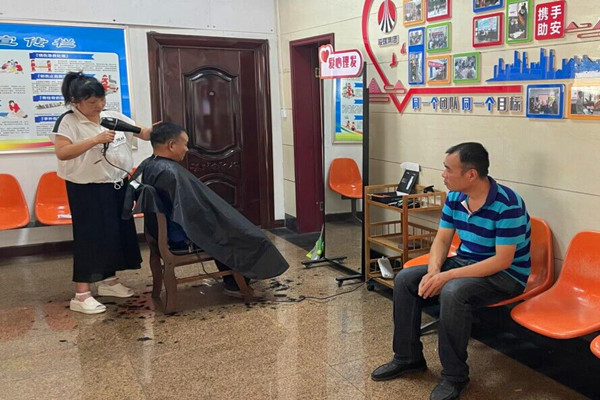 在陳家山煤礦井口候車場內(nèi),工會女工家屬協(xié)管員耐心地詢問職工的訴求,精心地為職工設(shè)計、修剪發(fā)型,幫助職工解決“頭”等難題。這一暖心舉動,受到職工一致好評。