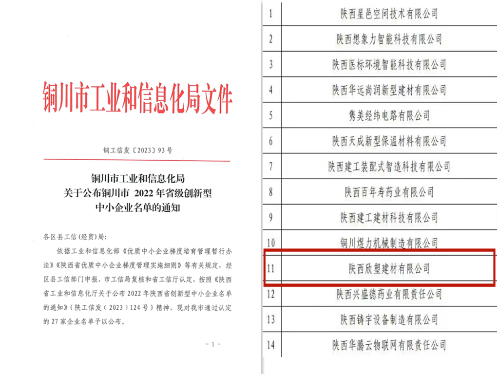 近日,陜西省工業(yè)和信息化廳公布了2022年陜西省創(chuàng)新型中小企業(yè)名單,欣塑公司憑借自身優(yōu)異的創(chuàng)新能力和專業(yè)化水平,順利通過了“陜西省創(chuàng)新型中小企業(yè)”認(rèn)定。