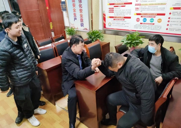“加油!加油!加油!”一場精彩有趣的“掰手腕”比賽在柴家溝井綜掘三隊學習室拉開了帷幕。職工們聚攏在一張桌子旁邊觀看比賽,預備開始了,全場頓時鴉雀無聲。個個目不轉睛,大氣不出,屏息凝神,生怕錯過一段精彩的片段。人高馬大的楊鵬揮揮舞動的手臂,秀出那副“完美的肌肉”,野心勃勃,像是穩(wěn)操勝券,還用王者的姿態(tài)盯著“渺小的啟勝”,從氣勢上壓倒對手。職工張啟勝也不甘示弱,用不好欺負的眼神回應楊鵬。那眼神好似在說:“誰輸誰贏還說不定呢!俗話說得好,人不可貌相,海水不可斗量?!彼麄兡θ琳?,準備大顯身手。隨著裁判員一聲發(fā)令:“開始”他們面對面全神貫注,把力氣集中在手腕上,右手緊握著對方的右手。胳膊肘貼在桌子上,一雙手臂緊貼在一起,用力向左邊扳,他們肌肉緊繃,憋足了氣,眼睛瞪得圓圓的。這個臉漲得通紅,那個咬緊牙關,個個額頭上都冒出了細密的汗珠,時刻不敢松懈。