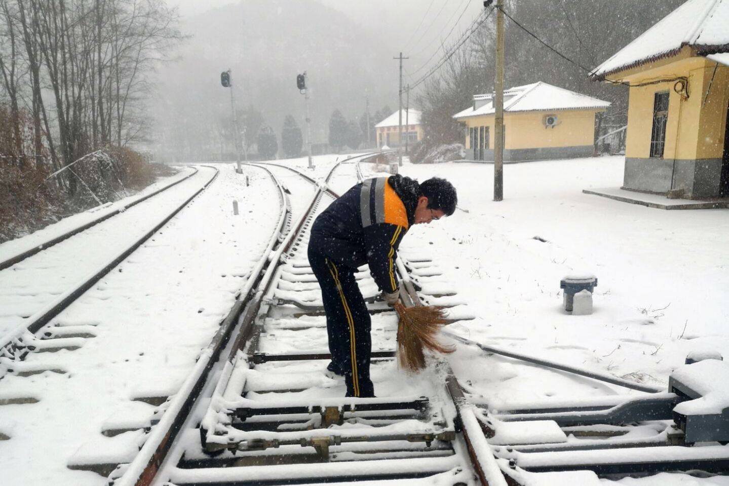 “陳家山車站線路已積聚冰塊積雪,為不影響行車安全,請(qǐng)迅速除冰掃雪”。8時(shí)20分,北區(qū)段值班室響起了急促的電話聲。負(fù)責(zé)人帶領(lǐng)職工拿著除雪鏟、掃把等除雪設(shè)備頂著漫天大雪,根據(jù)道岔分布情況,兵分兩路對(duì)站內(nèi)道岔進(jìn)行除雪工作。與此同時(shí),機(jī)車維修中心、工電段干部職工相繼出動(dòng),一時(shí)間,各個(gè)段站在各自管轄區(qū)域,開展除冰掃雪作業(yè),成功打通安全通道。