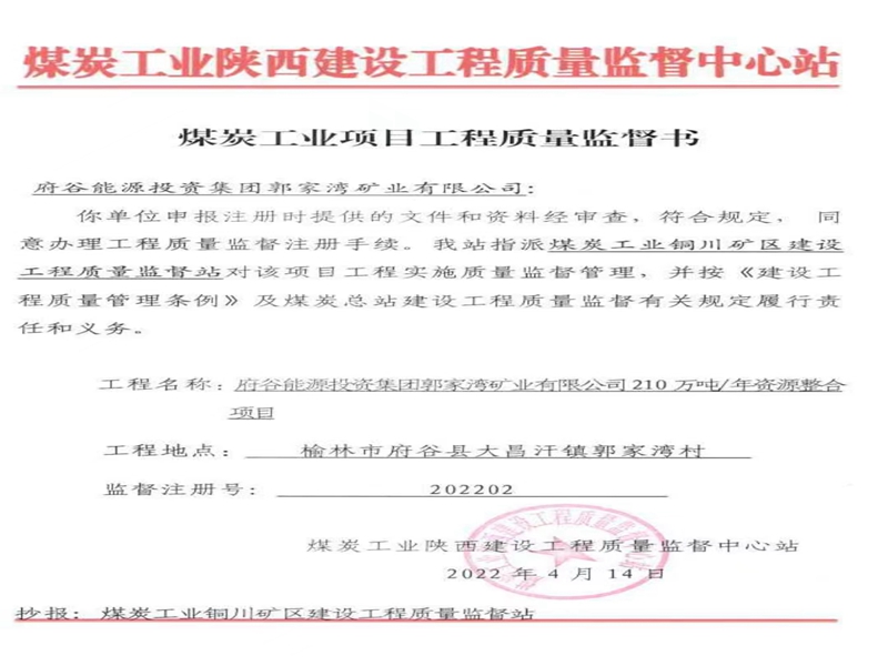 近日,銅川礦區(qū)工程質量監(jiān)督站受省能源局煤炭工業(yè)陜西建設工程質量監(jiān)督中心站指派,對府谷能源投資集團郭家灣礦業(yè)有限公司210萬噸/年資源整合項目實施質量監(jiān)督管理。