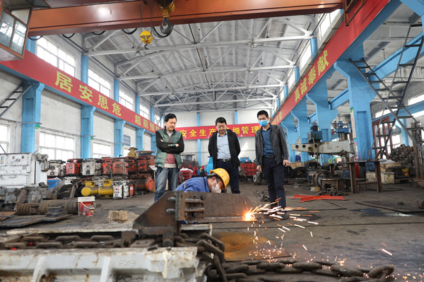 匹配智能綜采,堅持自主創(chuàng)新,針對這一情況該礦礦長、生產(chǎn)副礦長、安全副總工程師再次帶領(lǐng)技術(shù)創(chuàng)新小組向新課題發(fā)起攻關(guān),綜采隊擔(dān)負(fù)試驗調(diào)試任務(wù),機電車間的“能工巧匠”根據(jù)現(xiàn)場反饋不斷改進(jìn)。創(chuàng)新小組使用一節(jié)刮板輸送機溜槽,利用鋼板、圓鋼、角鐵等材料,組合設(shè)計出后部溜子積煤清掃器。 該裝置由固定底座、角度調(diào)節(jié)底座和旋頁板三部分組成,加工兩端上部開孔的4個“凹”字形緊固件,2個一組使用螺絲固定附著在鏈環(huán)上,在一塊鋼板底部,倒置4個同樣的緊固件,以“卯榫”的形式與底座焊接。在底座上覆蓋一塊三角錐體鋼板,將旋頁板和三角錐體之間固定成125度的鈍角,通過旋頁板在煤墻側(cè)與刮板輸送機同向運行,將架間煤清掃回收。