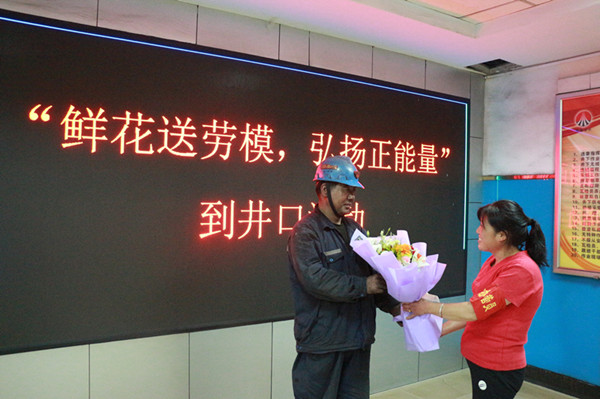“師傅,您辛苦了!我代表職工家屬感謝您一直以來(lái)的辛勤工作,祝您工作順利,健康平安。”女工協(xié)管員一邊對(duì)入井人員進(jìn)行安全叮囑,一邊遞上了鮮花。