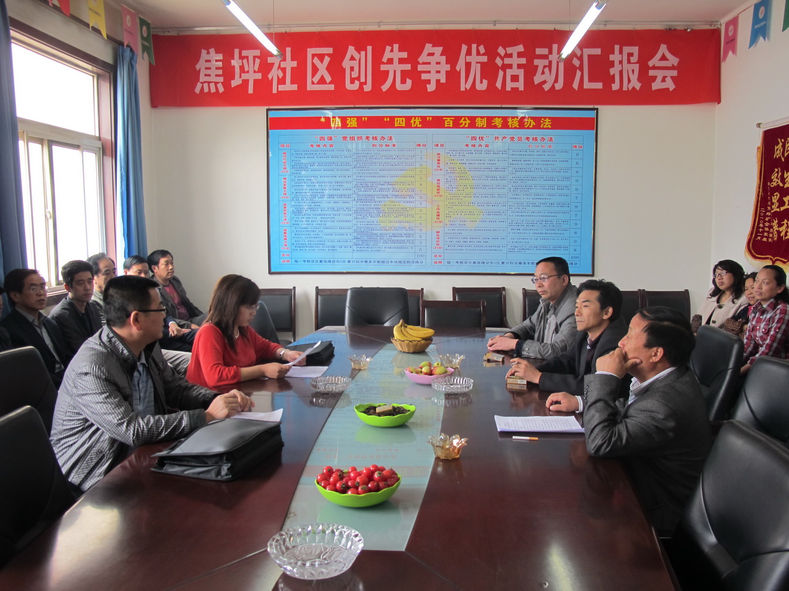 4月27日下午,公司(局)創(chuàng)先爭優(yōu)活動領(lǐng)導(dǎo)小組一行到焦坪社區(qū)管理中心檢查指導(dǎo)工作。領(lǐng)導(dǎo)小組成員何剛、成冰芳、寇長安、劉興、趙春雷聽取了社管中心一年來在創(chuàng)先爭優(yōu)活動中做的各項工作,按照檢查程序,社管中心離退休人員、女工、一線職工、機關(guān)部分代表15人對社管中心領(lǐng)導(dǎo)班子進(jìn)行了測評,何剛一行檢查了各類資料和會議記錄,肯定了在以創(chuàng)建“四好”黨組織,“四優(yōu)”共產(chǎn)黨員為主要內(nèi)容的創(chuàng)先爭優(yōu)活動中,能夠按照內(nèi)容和要求進(jìn)行,隊伍建設(shè)和黨員思想素質(zhì)不斷提高,服務(wù)群眾、服務(wù)職工意識不斷增強,在民生建設(shè)和人居環(huán)境改善方面做了大量卓有成效的工作,職工群眾普遍滿意,充分發(fā)揮了黨委核心作用、黨支部戰(zhàn)斗堡壘作用和黨員先鋒模范作用。同時,提出了在檢查當(dāng)中存在的問題和今后整改的意見。