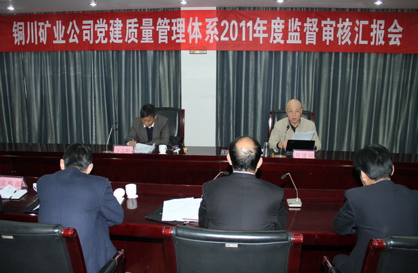 當(dāng)天上午,公司黨建質(zhì)量管理體系2011年度監(jiān)督審核匯報會在煤業(yè)賓館3號樓二樓會議室舉行。劉建民、王志陽出席會議,礦業(yè)公司黨委書記黃河主持會議并致辭;礦業(yè)公司黨委組織部部長王志鋒就我公司2011年度黨建質(zhì)量管理體系運行情況作專題匯報。礦業(yè)公司黨建質(zhì)量管理體系辦公室、黨委組織部、黨委辦公室、紀(jì)委監(jiān)察室、黨委宣傳部、團委、礦區(qū)工會、信訪辦、保衛(wèi)部、礦工報社等黨群部門負(fù)責(zé)人,鴨口煤礦有限責(zé)任公司、徐家溝煤礦有限責(zé)任公司、金華山礦、鐵路運銷分公司4個接受審核的單位黨委書記,礦業(yè)公司黨群各部門內(nèi)審員等參加了會議。