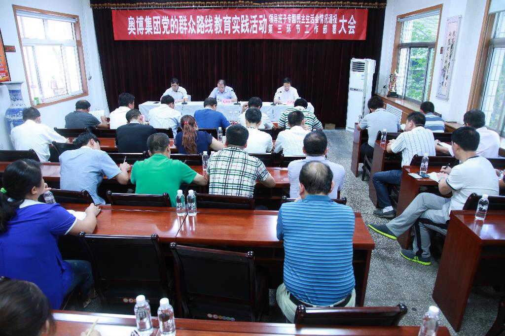 8月15日,奧博集團召開黨的群眾路線教育實踐活動領(lǐng)導班子專題民主生活會情況通報暨第三環(huán)節(jié)工作部署會議,礦業(yè)公司第三督導組蒞臨指導,集團和各企業(yè)黨政領(lǐng)導,綜合辦、計財部、生產(chǎn)技術(shù)部門負責人,黨員代表、女職工代表和總部全體人員50余人參加會議,會議由集團黨政負責人孔令臣主持。