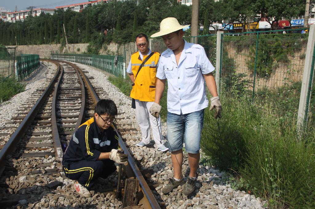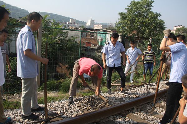 志愿者們共分為4組,手持鐵鍬、鐵叉、洋鎬,在鐵道線上勞動(dòng)起來。該分公司工務(wù)段銅川工區(qū)領(lǐng)工長宋明魁擔(dān)任施工指導(dǎo),不時(shí)地到每個(gè)工作點(diǎn)進(jìn)行查看,對于干活不熟悉、不老練的青年人手把手地教、一對一地做,直到大伙都會干為止。老本行出身的第一組——工務(wù)段青年志愿者服務(wù)隊(duì)成員由銅川工區(qū)馮剛擔(dān)任安全防護(hù)員,高凡、郭敏敏蹲在鐵道邊,拿著方枕器,對枕木距離進(jìn)行扶正,姜滿、楊慶等同志在清理著道石,只用了35分鐘,就完成了任務(wù)。第二組——機(jī)關(guān)青年志愿者服務(wù)隊(duì)成員李哲、劉銀榮等同志十分投入、非常賣力,青年志愿者服務(wù)隊(duì)舉旗手、紀(jì)委監(jiān)察科的周峰獨(dú)自一人清理道石,受到大伙夸獎(jiǎng)。第三組——機(jī)務(wù)段青年志愿者服務(wù)隊(duì)成員穆文凱、趙磊、王輝、劉世偉等同志當(dāng)仁不讓、各個(gè)領(lǐng)先,技術(shù)能手、“雙述”標(biāo)兵王鵬長得帥氣、精干,干起活來從不叫苦、也不叫累,青春的臉龐始終充滿著笑意,成為青年志愿者服務(wù)隊(duì)里“最可愛的人”。第四組——車務(wù)段的梁歡獨(dú)自一人干活,也不知道歇息,尤其是電務(wù)段的李陽真可謂是“活躍分子”,一邊干活,一邊調(diào)侃,一邊逗樂,輕輕松松,自自在在,開開心心,勞動(dòng)現(xiàn)場的笑聲伴隨著鐵鍬聲、鐵叉聲、洋鎬聲、清石聲激越在鐵道線上,奏響了一曲曲青春勞動(dòng)之歌。
