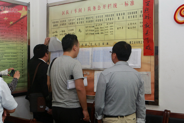 互檢工作組一行到礦后,與該礦領導進行了座談,聽取該礦開展礦務公開民主管理工作情況的匯報。隨后,互檢組成員對該礦工會礦務公開民主管理基礎資料進行查看,并到基層單位觀看了礦務、隊務公開欄及職工活動室。同時還組織該礦10名職工代表進行了座談。