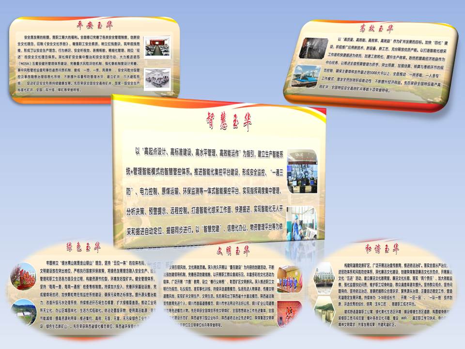 “平安玉華”以貫徹落實(shí)習(xí)近平總書(shū)記關(guān)于安全生產(chǎn)重要論述和指示批示精神為遵循,通過(guò)安全管理體系建設(shè)的文字圖片介紹展示礦井安全發(fā)展歷程,引領(lǐng)職工樹(shù)牢“生命至上、人民至上”安全發(fā)展觀?!案咝в袢A”圍繞提高經(jīng)濟(jì)效益中心任務(wù),明確定位“高質(zhì)量、高效能、高效率、高效益”工作目標(biāo)。“智慧玉華”描繪出“高起點(diǎn)設(shè)計(jì)、高標(biāo)準(zhǔn)建設(shè)、高水平管理、高效能運(yùn)作”的“智慧黨建”、智能化開(kāi)采、智能化快掘等同步一體式建設(shè)“智慧礦山”的發(fā)展藍(lán)圖?!拔拿饔袢A”引領(lǐng)向上向善、立德樹(shù)人文明之力,形成奮發(fā)有為、崇德向善的濃厚氛圍。“和諧玉華”堅(jiān)持群眾路線,“以人民為中心”著眼職工利益和幸福生活,全力打造“扎根工程”和民心工程。“綠色玉華”把生態(tài)建設(shè)擺在突出位置,全面構(gòu)建資源節(jié)約型、環(huán)境友好型的綠色生態(tài)新礦山。