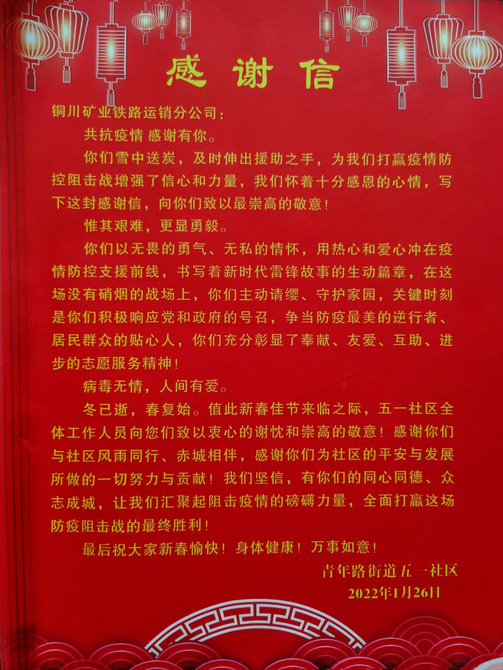 1月26日下午,鐵運分公司收到青年路街道五一路社區(qū)送來的感謝信,對分公司選派黨員干部團員下沉社區(qū)奔赴抗疫一線支援社區(qū)疫情防控工作表示感謝。 這既是對下沉黨員干部的點贊,也是對鐵運分公司積極參與疫情防控工作的一個肯定。