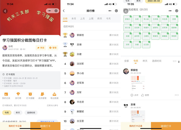 該礦機(jī)關(guān)三支部針對部門和黨員較多,且地面和井工任務(wù)較重,開展集中學(xué)習(xí)受影響的實(shí)際情況,把當(dāng)前開展理論學(xué)習(xí)的重點(diǎn)放在了學(xué)習(xí)強(qiáng)國上,并在督促考核方面“想點(diǎn)子、做文章”,確保黨員干部堅(jiān)持線上學(xué)習(xí)、樂于學(xué)習(xí)、學(xué)有所獲。經(jīng)過一番嘗試,發(fā)現(xiàn)“接龍管家”具備學(xué)習(xí)監(jiān)督督促功能,于是自4月1日開始嘗試運(yùn)用APP做好黨員學(xué)習(xí)教育工作。一個多月下來,效果立竿見影。 該支部通過“接龍管家”—“愛國學(xué)習(xí)”模塊中學(xué)習(xí)強(qiáng)國完成情況統(tǒng)計(jì)功能,將支部黨員納入統(tǒng)計(jì)范圍,每名黨員匯報(bào)學(xué)習(xí)完成情況,每天完成“打卡記錄”。支部書記根據(jù)反饋情況點(diǎn)評學(xué)習(xí),剖析共性問題,“一對一”指導(dǎo)個性問題進(jìn)行查弱補(bǔ)強(qiáng)。同時在模塊中建立學(xué)習(xí)排行榜,發(fā)揮出相互監(jiān)督作用,凸顯線上時時監(jiān)督的功能,使后進(jìn)對標(biāo)先進(jìn)趕超有動力,先進(jìn)保持領(lǐng)先有壓力。