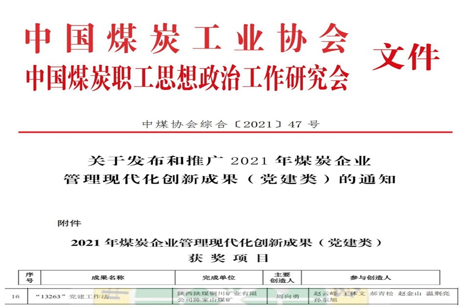 近日,從中國煤炭工業(yè)協(xié)會、中國煤炭職工思想政治工作研究會獲悉,陳家山礦《“13263”黨建工作法》榮獲2021年煤炭企業(yè)管理現(xiàn)代化創(chuàng)新成果(黨建類)二等獎。
