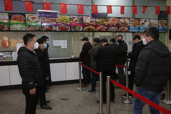 “年輕人嘛,吃飯時間比別人晚點,辛苦一些不重要,可以為疫情防控工作盡一點綿薄之力,確保咋們的職工安全,一切都值得!”職工餐廳排隊的人群里,李偉正在耐心勸導盡量將飯菜帶回宿舍吃,吃飯時大家盡量少交談,看著職工就餐快結束了,這才拿出自己的碗筷打飯。