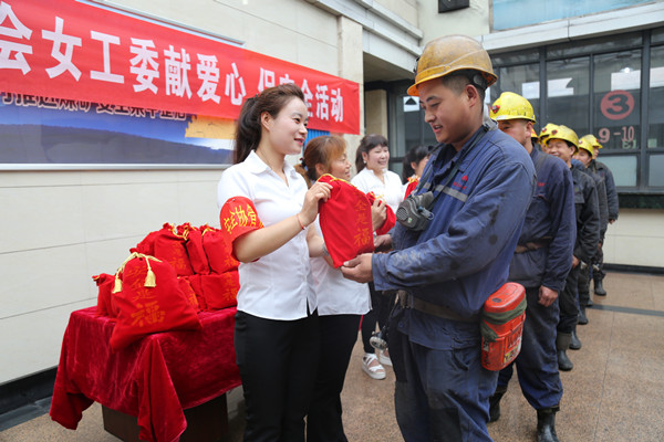 在該礦井口候車大廳里,該礦女工委組織家屬協(xié)管早早來到井口服務(wù)站,一陣忙活準(zhǔn)備后,親手將精心準(zhǔn)備的福袋、香皂、毛巾等生活用品送到職工手里。