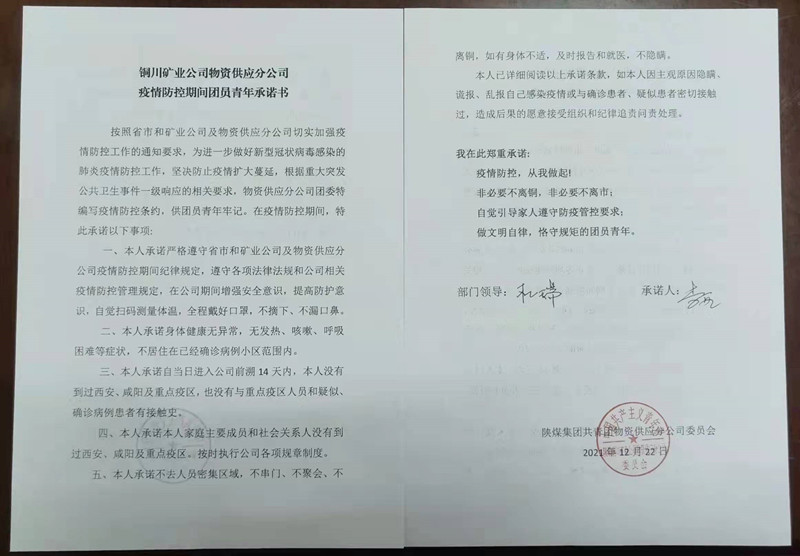 根據(jù)重大突發(fā)公共衛(wèi)生事件一級響應(yīng)的相關(guān)要求,該公司團委組織團員青年開展疫情防控線上總動員,人人做起寫好疫情防控承諾書,該公司53名團員青年們主動跟所在團支部簽訂疫情防控承諾書,紛紛表示,疫情防控,從我做起,非必要不離銅,非必要不離市,自覺倡導家人遵守防疫管控要求,做文明自律,恪守規(guī)矩的團員青年,為疫情防控貢獻青春力量和青年正能量。