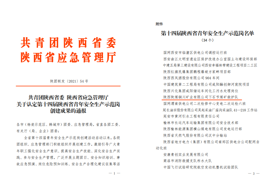 近日,共青團陜西省委、陜西省應急管理廳聯(lián)合組織開展的第十四屆陜西省青年安全生產(chǎn)示范崗創(chuàng)建活動結果揭曉,下石節(jié)礦救護隊喜獲陜西省青年安全生產(chǎn)示范崗榮譽稱號。