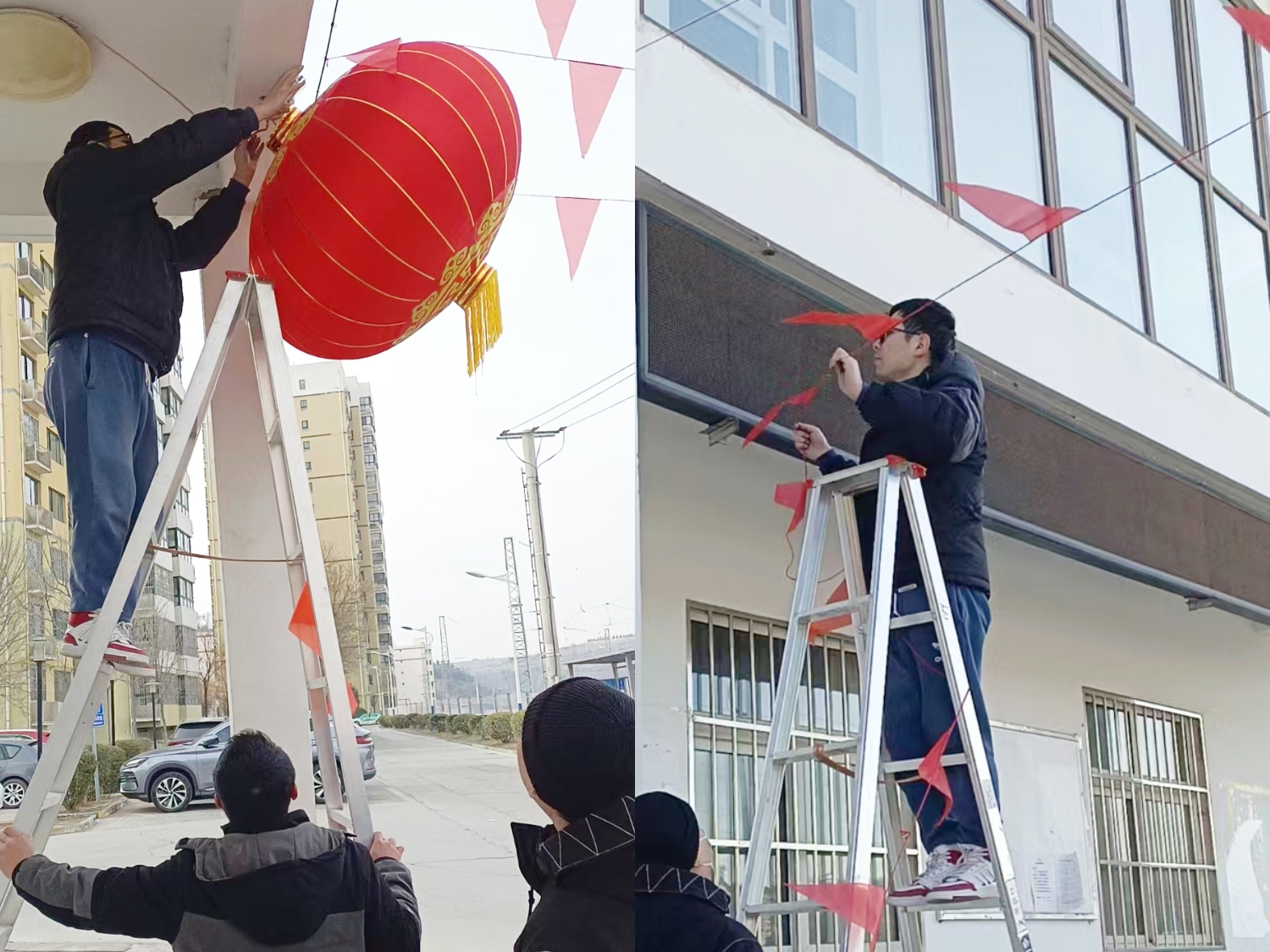 工作人員們帶上各類工具,剪刀在手中閃著銀光,膠帶緊緊纏繞在手臂上,他們扛著長長的梯子,小心翼翼地搬運(yùn)著大紅燈籠與五彩斑斕的小彩旗,滿懷熱忱地奔赴小區(qū)大門處?,F(xiàn)場,大家分工明確,有的穩(wěn)穩(wěn)扶住梯子,確保登高作業(yè)的安全;有的熟練地操控剪刀,裁剪著燈籠的裝飾穗子;還有的踮起腳尖,高高舉起手臂,用膠帶將燈籠與彩旗牢固地懸掛在客服中心門廊之上。不一會(huì)兒,一個(gè)個(gè)火紅的大燈籠高高掛起,鮮艷奪目,宛如熟透的紅柿子,照亮了小區(qū)的入口。小彩旗也在微風(fēng)中歡快地舞動(dòng),發(fā)出沙沙聲響,似在奏響新春的樂章。放眼望去,整個(gè)小區(qū)被裝點(diǎn)得年味十足,處處洋溢著歡樂、祥和、喜慶的氛圍。
