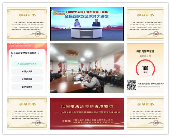 為深入學(xué)習(xí)領(lǐng)會習(xí)近平法治思想的重大意義、豐富內(nèi)涵、精神實(shí)質(zhì)和實(shí)踐要求,大力學(xué)習(xí)宣傳總體國家安全觀,該中心明確學(xué)習(xí)內(nèi)容,緊扣“全民國家安全教育 走深走實(shí)十周年”主題,圍繞總體國家安全觀有關(guān)內(nèi)容,以觀看講座、線上答題和朗讀相結(jié)合,引導(dǎo)廣大職工通過掃描活動二維碼,直接進(jìn)入答題環(huán)節(jié)參與只是競答和朗讀活動,堅(jiān)持每日觀看一個講座片段、答一份競賽試題,堅(jiān)持每日朗讀一個法條段落。全體參與活動人員均獲得《2025年全民國家安全教育學(xué)習(xí)證書》。
