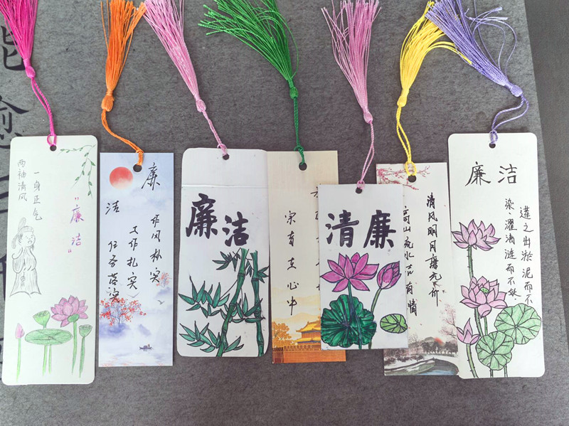 活動現(xiàn)場,黨員代表們發(fā)揮想象,各自選擇了跟“廉”有關(guān)的底稿,開始動手實踐。經(jīng)過精心繪畫和書寫,一張張與廉潔有關(guān)的書簽作品展現(xiàn)在大家面前。有的寫著剛正不阿的“廉”字,有的以蓮花為題突顯一塵不染的廉潔之質(zhì),有的畫著“廉”與詩人的鮮明對比栩栩如生。