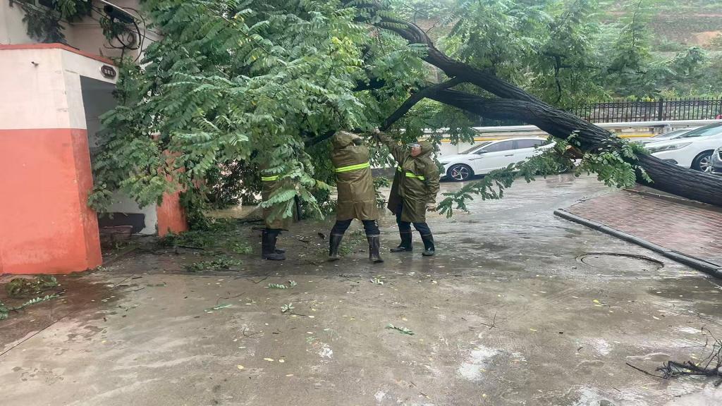 電鋸的轟鳴聲瞬間壓過了風(fēng)雨聲,他們動作麻利地對倒伏的樹木進(jìn)行分段切割。雨水和著汗水浸濕了他們的臉龐,泥漿沾滿了褲腿,但他們沒有絲毫懈怠。有人奮力拉扯繩索控制樹干倒向,有人仔細(xì)清理散落的枝葉,還有人迅速將截斷的木材搬運到指定地點。整個搶修過程緊張有序、忙而不亂,也展現(xiàn)了物業(yè)人員訓(xùn)練有素的應(yīng)急處理能力。